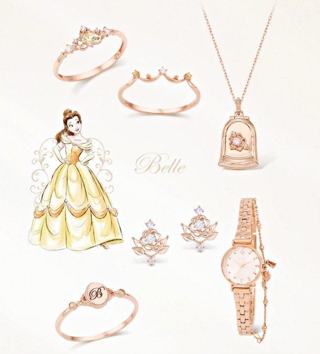 不管在哪一個版本的《美女與野獸》中,「玫瑰花」都是最重要的象徵,也是貝兒與野獸的牽絆…這波聯名除了在戒指上鑲上代表貝兒的黃色心型寶石,耳環、手錶以及項鍊都用浪漫玫瑰金勾勒出玫瑰的模樣。
