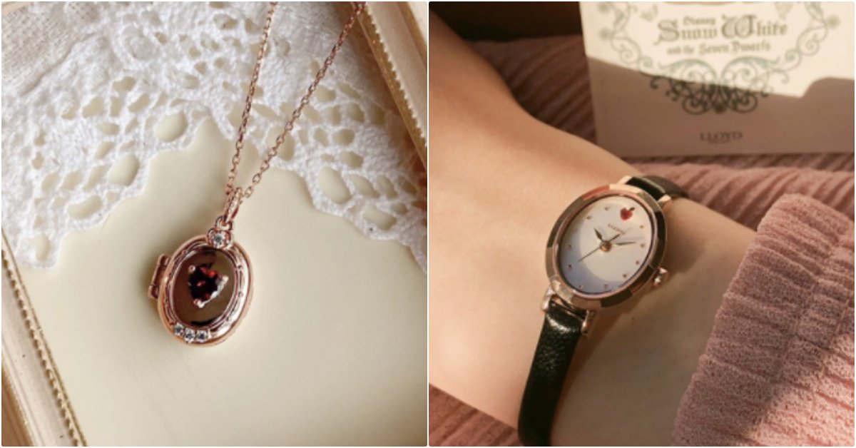 鮮紅的毒蘋果改用「紅色愛心寶石」完美表現,鑲上戒指以及項鍊上,仔細一看…手錶上的12刻度也被偷偷換成了一顆心型蘋果了!