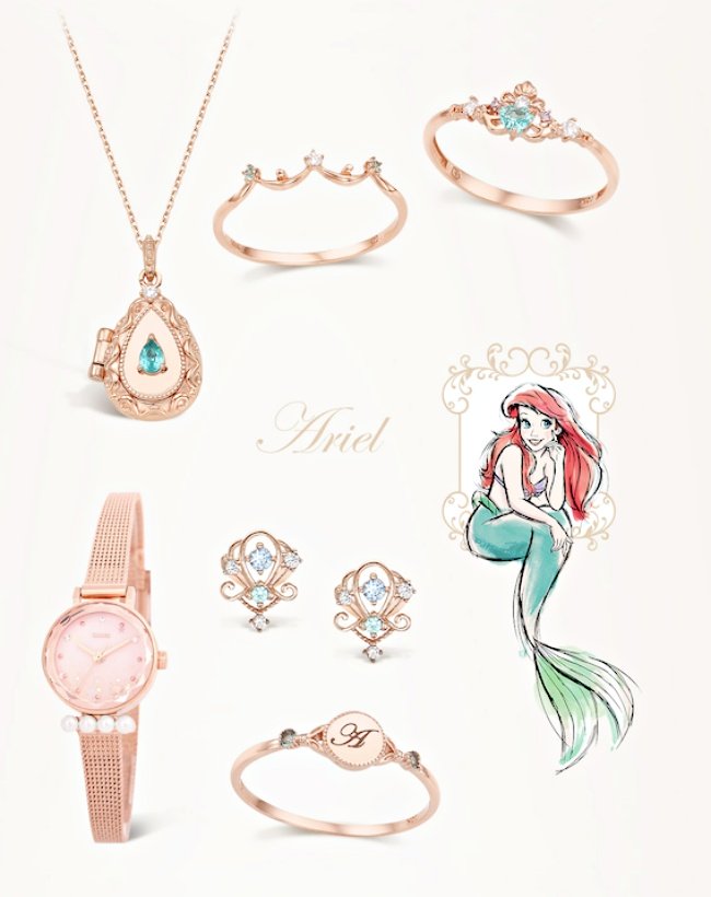 《小美人魚》中在湛藍海洋裡自在遨遊的愛麗兒公主,幻化成一顆水藍寶石(好像人魚的眼淚),裝點在精緻金飾上,聯名手錶則是用多顆海底珍珠優雅點綴,同時還推出結合藍鑽的超美「貝殼耳環」。