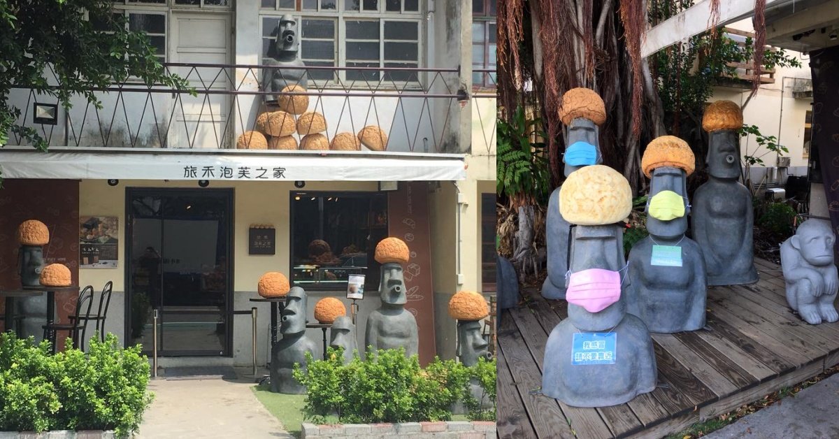 位於台中審計新村裡的甜點店「旅禾 泡芙之家」,門口坐落著一個個帶著泡芙頭飾的摩艾石像,嘟嘴呆萌的表情很療癒,而現在因為疫情的關係,其中有幾個石像也帶起了口罩,妞編輯看到的時候真的忍不住噗哧笑了出來,因為實在是太可愛了,妞妞們在門口拍完照後,也可以進到店裡買幾樣小點心品嚐看看,網路上對於口味的評價也相當不錯唷!