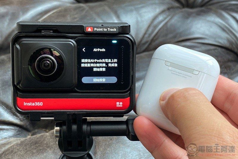 跳轉頁面之後會出現說明,這裡就直接按著 AirPods 充電盒背面的按鈕,直到閃爍白燈就可以選擇 Insta360 One R 機身上的「開始搜索」,來找你手上的這台 AirPods:
