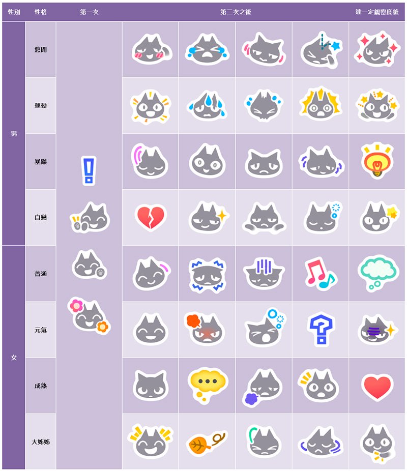 在達成觸發條件後,每天最多會有一次居民教你表情符號的機會。依照不同動物個性、性別與親密度,你可以學到各種不同的表情,下面筆者將它整理成一份表格供大家參考:
