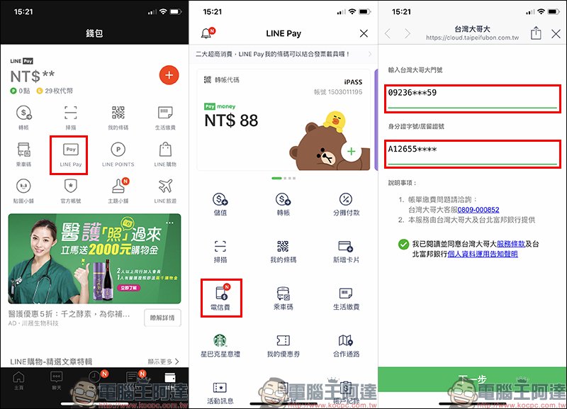 即(1)日起,只要各位是台灣大哥大行動通訊用戶,便能使用 LINE Pay 來支付電信費帳單囉!只要在 LINE App 的「錢包」頁面,先點選 LINE Pay 並進入「電信費」專區,接著輸入個人手機門號及身分證字號或居留證號,即可使用綁定 LINE Pay 之信用卡/簽帳金融卡,在簡單幾步驟輕鬆完成當期電信帳單付款:
