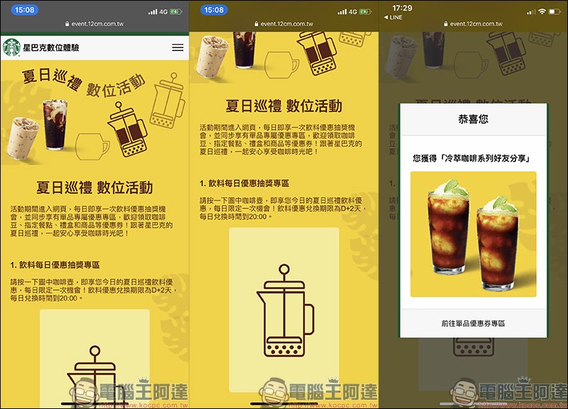 近日活動頁面,只要點選畫面圖中的咖啡壺,即可顯記音日的夏日巡禮飲料優惠。每個帳號每日限定一次機會,飲料優惠兌換期限為當日+2天。例如 6 月 1 日領取到「冷萃咖啡系列好友分享」的飲料優惠券,可兌換時間為 6 月 1 日至 6 月 3 日這三天當日門市營業開始起至晚上 8 點這段時間。