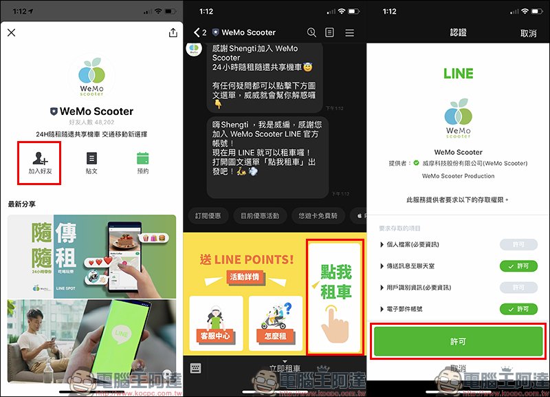 其實早在上個月下旬, WeMo Scooter 共享機車用戶除了既有 App ,也可透過 WeMo Scooter 的 LINE 官方帳號(LINE ID: @wemoscooter)直接「隨傳隨租」WeMo Scooter 。將加為好友後,點選聊天室下方功能列點選「點我租車」,或直街在 WeMo Scooter 官方帳號點選「預約」即可租車。首次使用虛驚。首次使用須先同意相關存取權限: