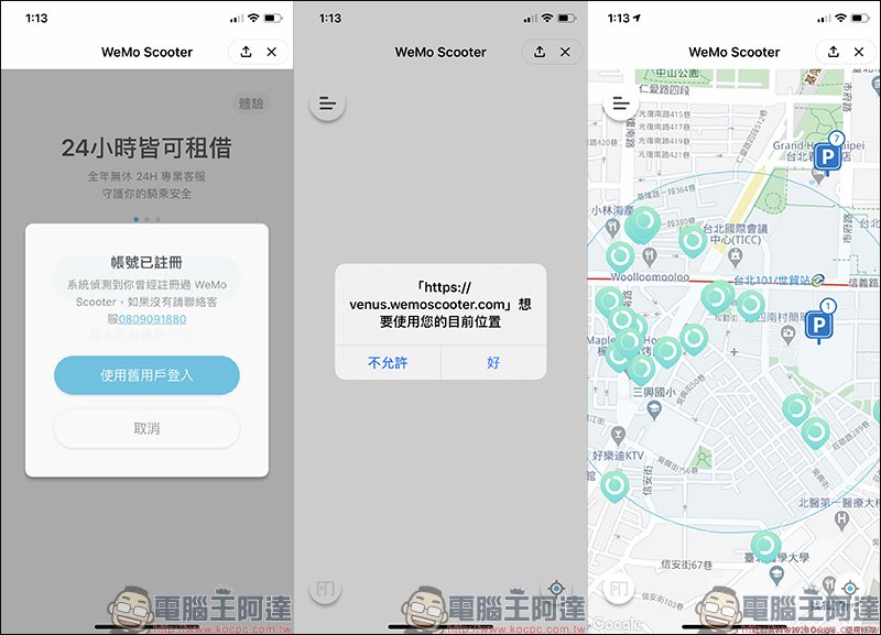 倘若為已經註冊帳號,可選擇「使用舊用戶登入」,並完成相關身份驗證手續,最後建議同意使用目前位置,以便精準搜尋附近可租借的車輛囉!