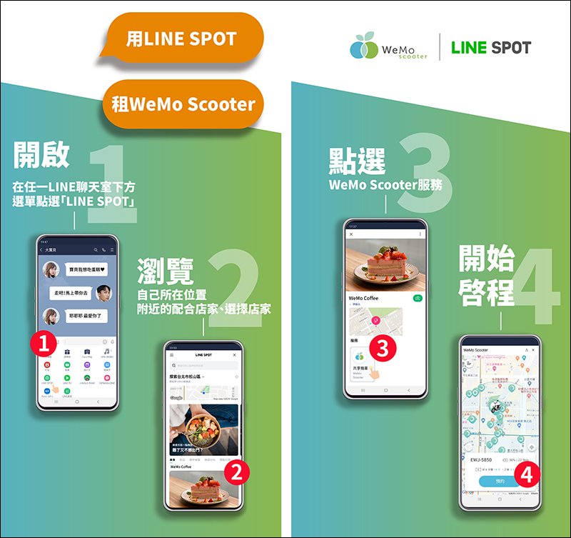WeMo Scooter 共享機車與 LINE 合作,除使用 LINE 官方帳號即可租車,再結合 LINE SPOT 啟動租車服務