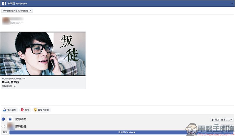 如果想將「How哥產生器」分享給 Facebook 的好友們,可點選畫面左上角的「分享到 Facebook」將它分享至 Facebook 塗鴉牆: