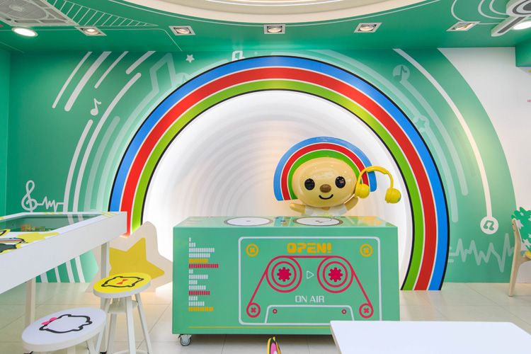 牆面呼應OPEN小將彩色頭冠設計,呼應夢想音樂主題,天花板以巨大條碼貓DJ唱盤設計,休憩區最前方是OPEN小將手持耳機的DJ造型公仔直播台,耍酷的模樣非常討喜。
