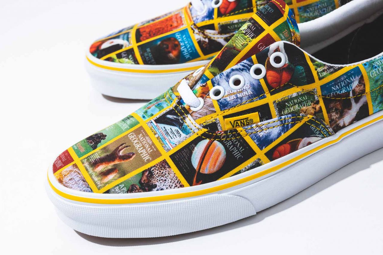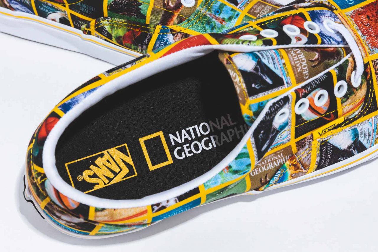 以經典的 VANS Era 鞋款為主,在帆布上印刷著滿版 National Geographic 各期精彩的封面拼貼,將 National Geographic 的精彩一次展現,一次匯齊攝影師們的心血,也是這次聯名的注目代表鞋款,也是編輯私心最喜歡的一款。