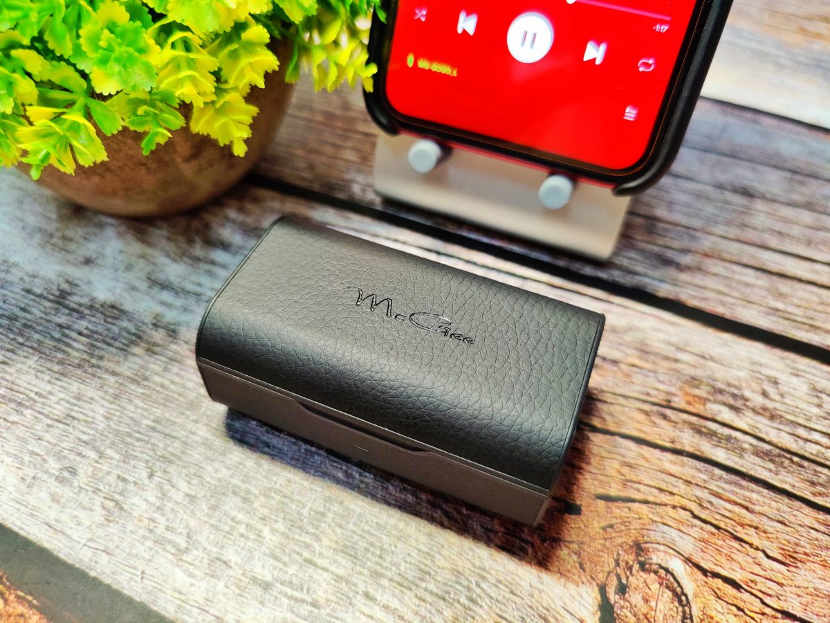 筆者拿起「 McGee MG-GoGo 」的那一刻,可以發現真無線藍牙耳機體積非常小,但拿起來的重量感受上卻相當沈重。充電艙外觀採用的是皮革與塑料的複合材質,精緻程度相當高,給人高貴的尊爵感。耳機部分單耳約 4 克,含充電艙重量約為 101 克,整體重量偏重、體積小、攜帶相當方便。
