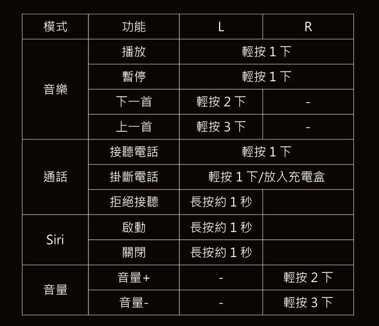 另外在耳機操作部分,「 McGee MG-GoGo 」所使用的控制皆為觸控操作,筆者實測觸控的靈敏度相當高,並且觸控功能部分涵蓋相當多操作,連筆者最愛也是少數耳機支援的音量調整都有支援,這點筆者必須給予好評,詳細操作如上圖所示。