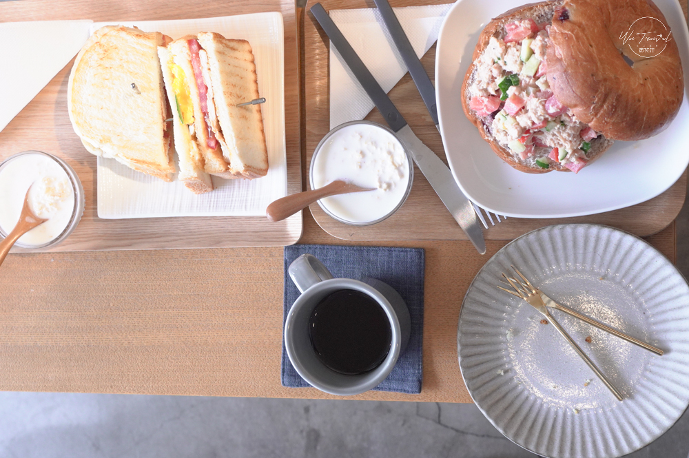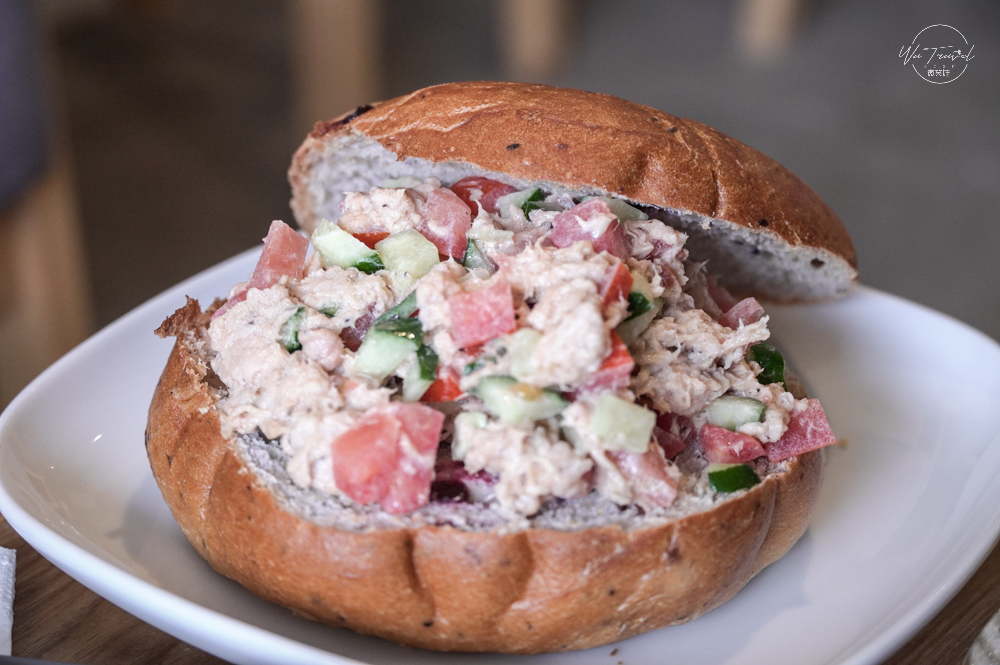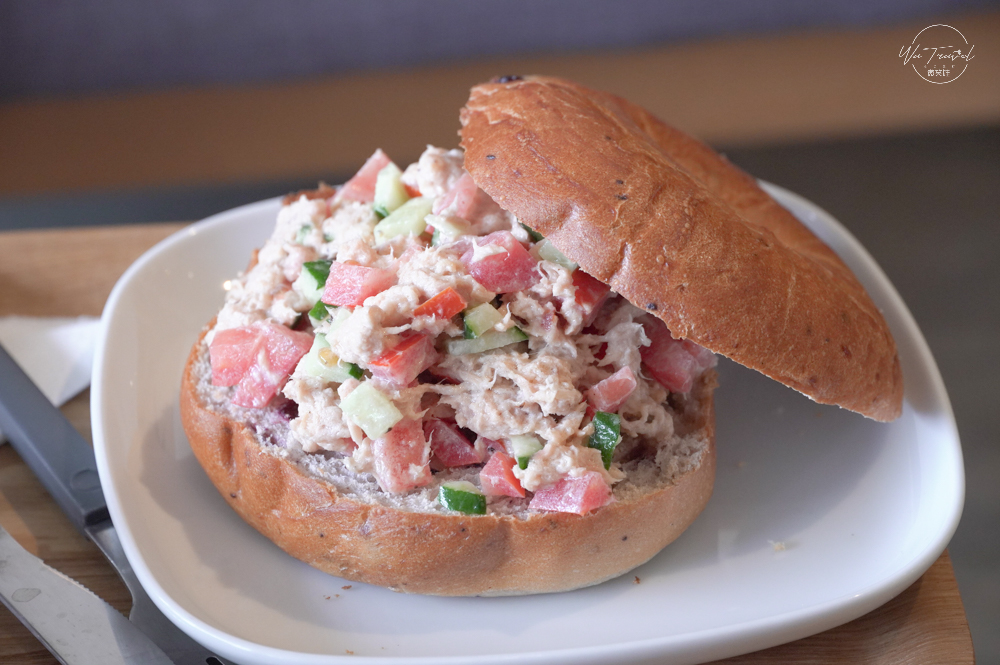 鮪魚沙拉拌入番茄與小黃瓜,吃起來口感清爽,搭配有Q度有嚼勁的貝果,會有飽足感,輕食類的大享受,內餡量很多,在吃的時候要小心注意。