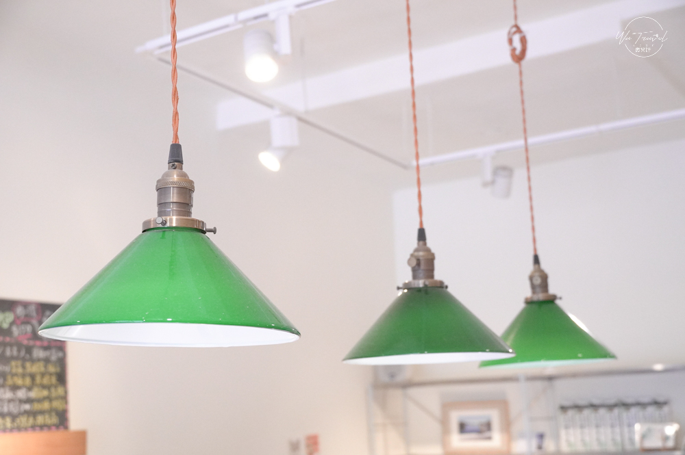 小森咖啡的內部簡約,燈飾卻有很多不同的小小變化,吧檯上方的綠色燈飾有一種點亮室內裝修的氛圍,就如其名「小森」咖啡。
