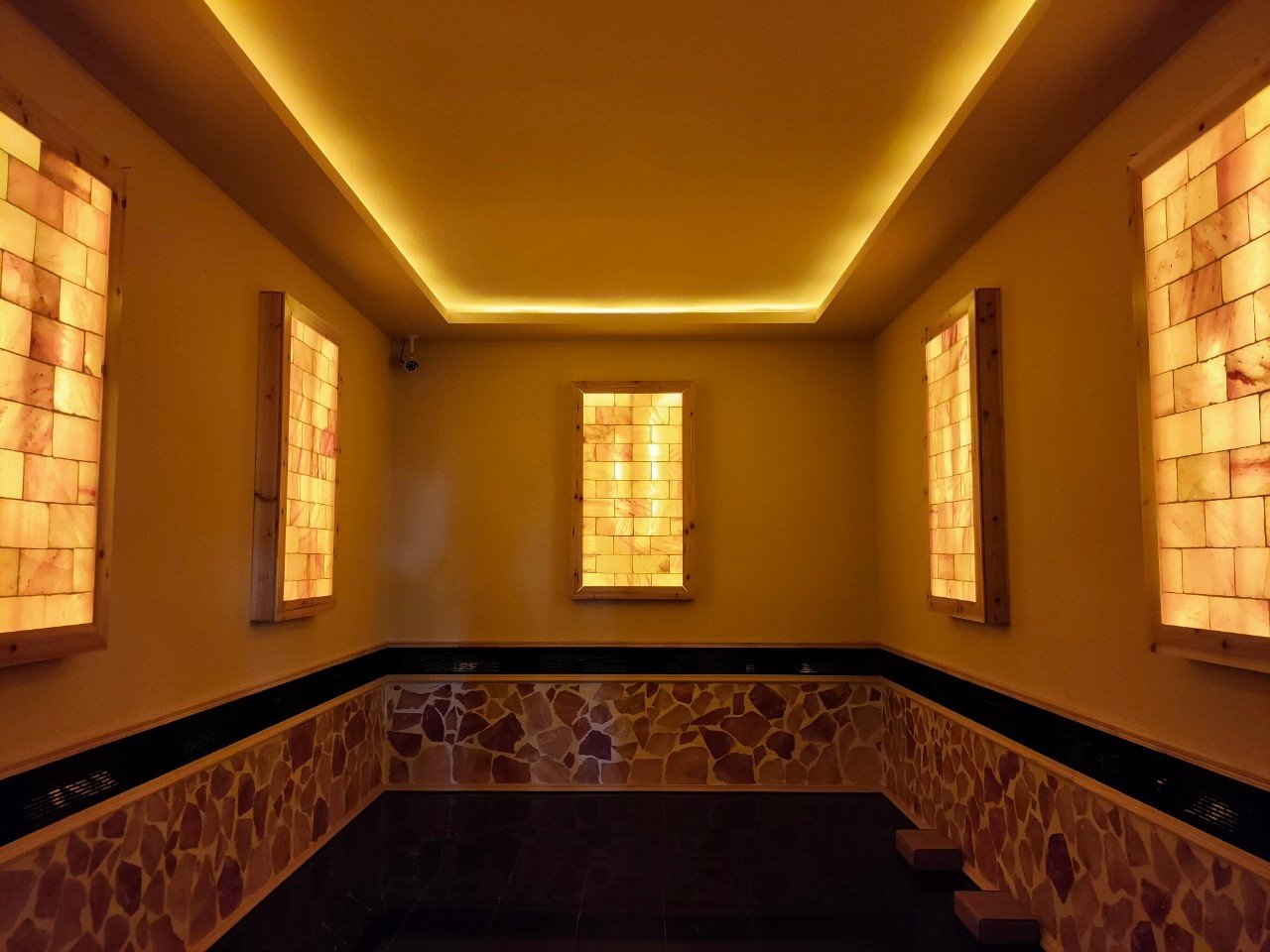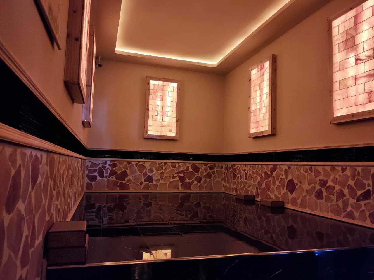 「汗沐蒸」的蒸室與一般高溫的三溫暖不同,房間地板內佈滿砭石,可以發出對人體有益的遠紅外線促進身體微循環、調理新陳代謝,除了砭石以外,房內最特別的就是那一面粉色的「喜馬拉雅山礦鹽」牆,經過燈光和遠紅外線照射過後,產生的負離子和微量元素可以讓妞妞們有放鬆身心、改善疲勞及呼吸道系統的效果喔(妞編輯自己是烤一烤發現鼻子過敏有通一點點啦)~