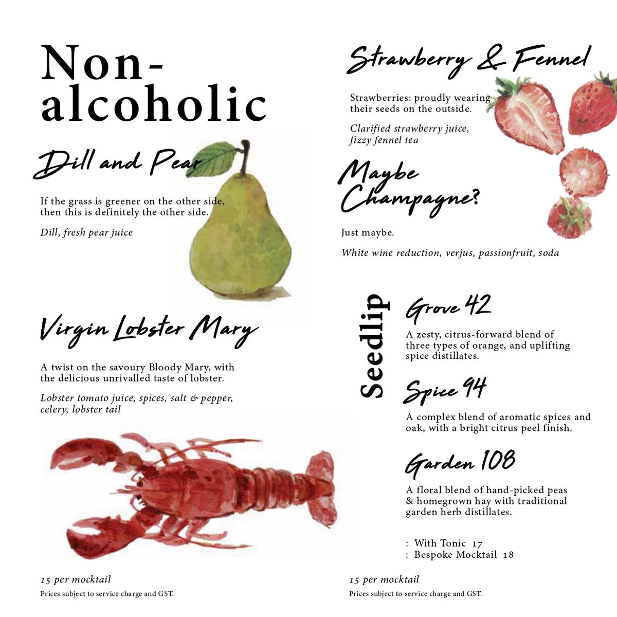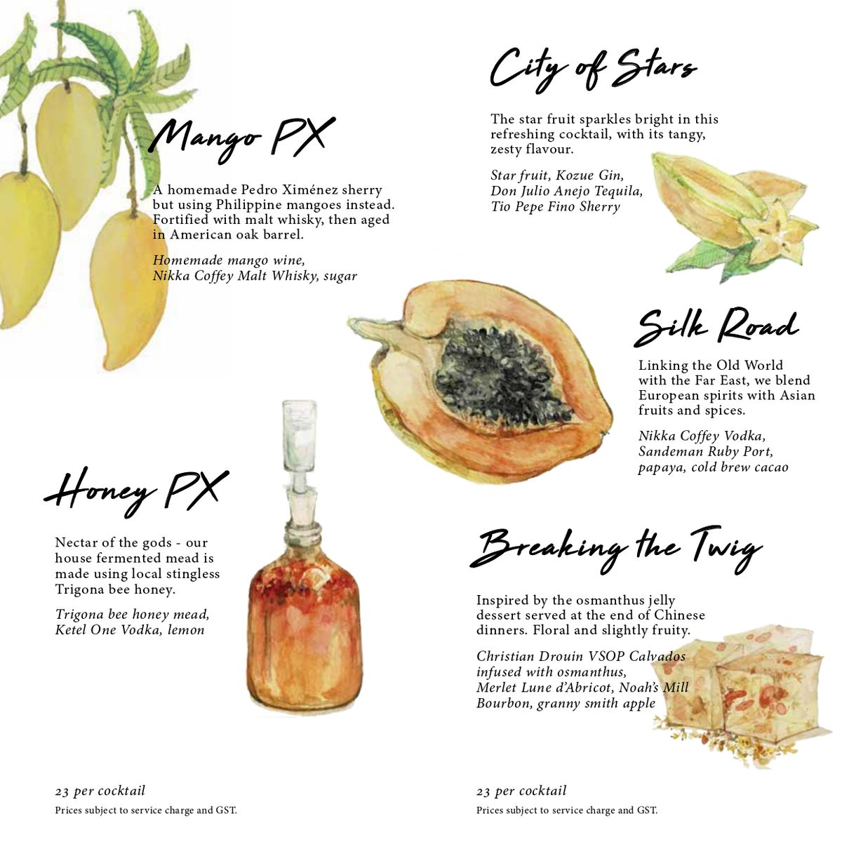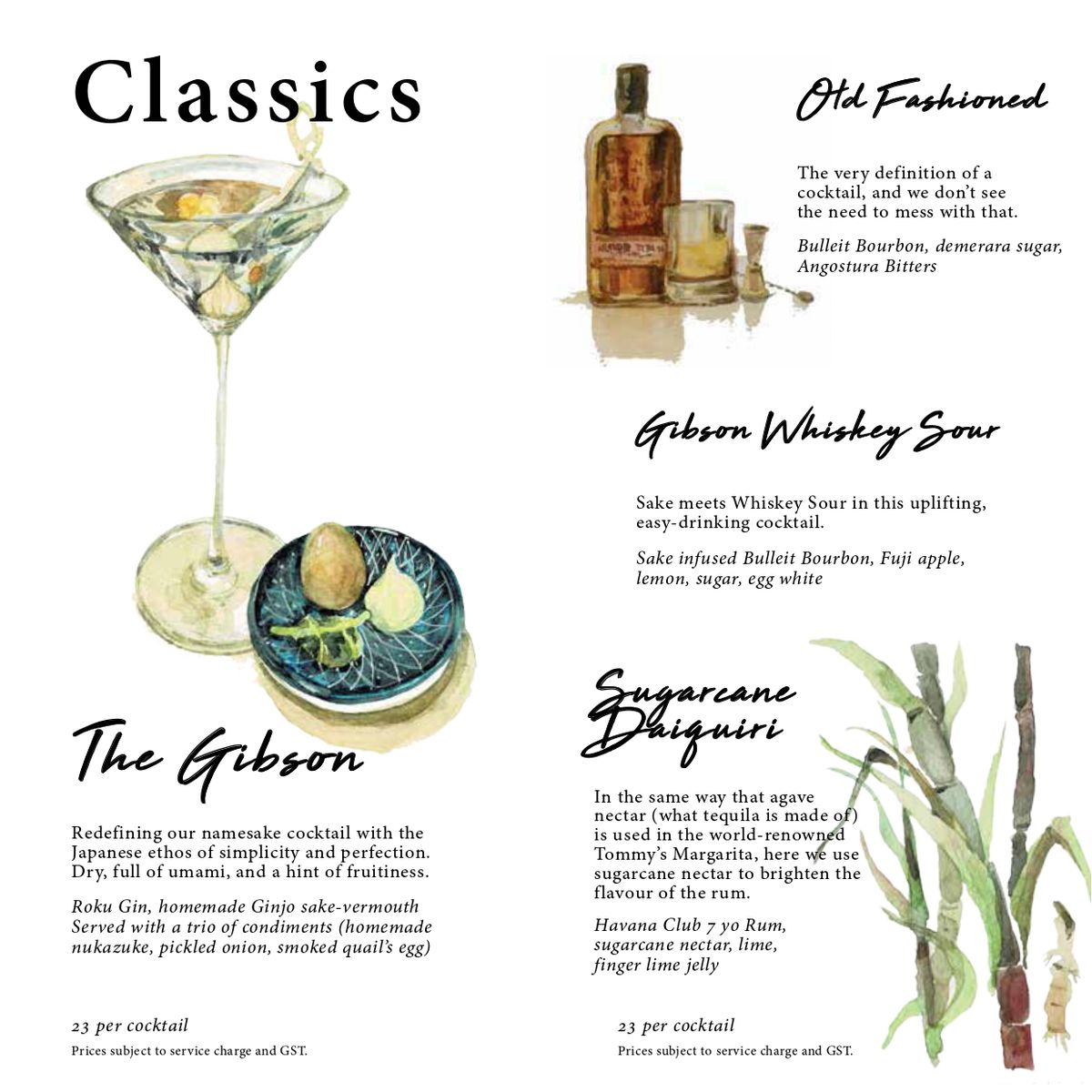 Gibson一共備有24種雞尾酒,皆由調酒師以最高水準的手藝與優質烈酒調製而成,每一種雞尾酒都能透過最獨特的方式吸引賓客們的感官注意力,更有趣的是Menu都以手繪方式呈現,像是一本精美的畫冊一般。而來自日本的首席調酒師Gento Torigata 則在創造雞尾酒的過程中扮演重要角色。Gento早在大學時代,就一直懷抱開創自己事業的夢想,這也是促使他踏上餐飲業的最大動力,大學畢業後,他在不同間的法國餐廳與法式甜點店工作了數年,但隨著時間流逝,Gento發現自己真正想要的東西是一種讓他能夠在發揮創造力、磨練手藝的同時還可以與顧客自在互動的關係,於是26歲時,他決定在東京銀座一家傳統的日式酒吧擔任學徒並開始調酒,後來並在澳洲的Toko Sydney(2015年NSW最佳日本餐廳)擔任調酒師。2016年,Gento參加新加坡Merlet Sidecar雞尾酒調酒大賽,並奪得冠軍,且在2017年受Gibson邀請加入團隊,至今替Gibson做出巨大貢獻,同時成為其他學徒調酒師的可敬榜樣。