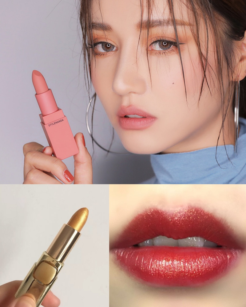 裸色、金色單擦不好駕馭,怕看起來病懨懨?疊加一起準沒錯,還會讓唇色時尚度爆棚~金色的珠光可以幫裸色唇畫龍點睛,同時增加幾分紅潤感,呈現出類似潤色護唇膏的效果,讓唇妝有些夢幻,但也給人好氣色、溫柔的感覺。另外,金色唇膏不只可以幫裸色唇增添質感,和正紅色也是絕配唷!