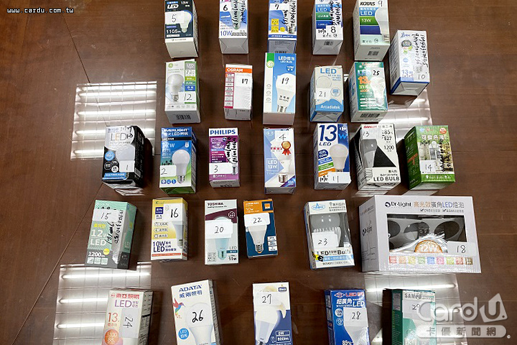 消保處共採樣29組市售LED燈泡,檢測項目包括「功率」、「光通量」、「發光效率」、「色溫、色差及演色性」,以及最多人在乎的燈泡使用壽命「光束維持率」等。為避免誤差,每一款LED燈泡都同時測試5顆,而使用壽命檢測,是標示時間的25%,例如標示寫說可使用2.5萬小時,即檢測6千小時,且光束維持率須達70%。