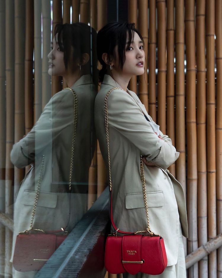 近日在多部戲劇上,都讓人留下深刻印象的王淨,則用成套的帥氣西裝襯托出正紅色款式的 Prada Sidonie!相比於用同色系的搭配手法,王淨用反差色彩的穿搭術,讓包款成為穿搭中的最大亮點!