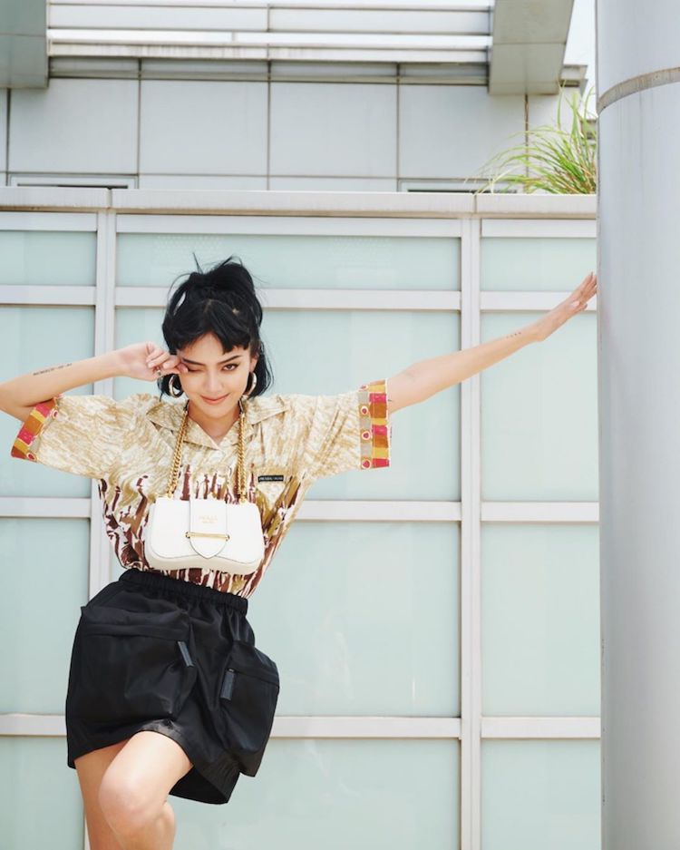總能以街頭造型收服人心的李函,這次依然用酷女孩的方式把 Prada Sidonie 揹的超級帥!衣服上選用同品牌的高腰短裙及襯衫做穿搭,包款上則挑選白色款式做搭配,加上短髮高馬尾的隨性造型,讓原本優雅的包款變得更有個性!