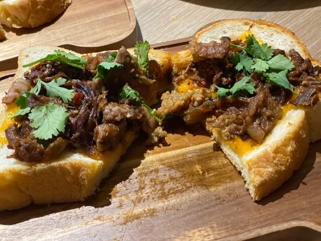 妞編輯私推「經典牛脾氣開放式三明治」,嚴選半筋肉,慢火燉煮將近八個小時,再加入微兜主廚私藏「花椒香醬」,一口下去除了能夠吃到牛肉的軟嫩之外,花椒的香氣更是神來一筆,讓人吃到欲罷不能!