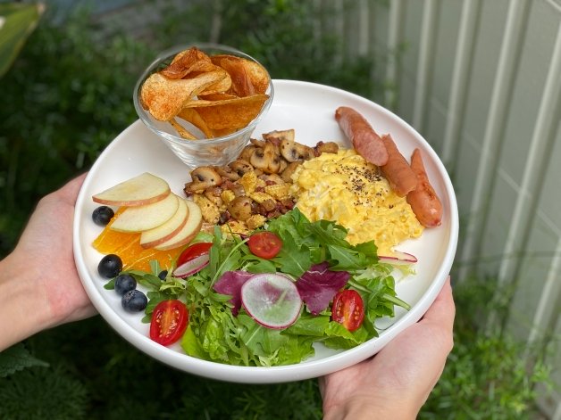 以上六道甜鹹早午餐皆含有「早餐餐盤」(如上圖) ,包含鮮脆時蔬沙拉、季節限定水果、滑嫩炒蛋、德國香腸、培根鹹香炒菇和鮮炸薯片等!