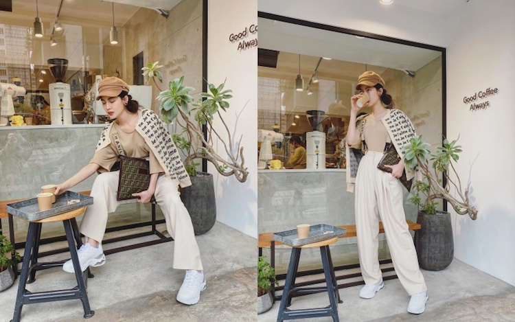 Fendi 的復古老花這就這幾季的大勢單品!曾之喬以包款的深咖啡色做延伸,搭配淺色的服裝與帽款,讓整體的穿搭像是咖啡牛奶般的色調,加上吊帶細節則讓整體風格充滿男孩感的氣息。