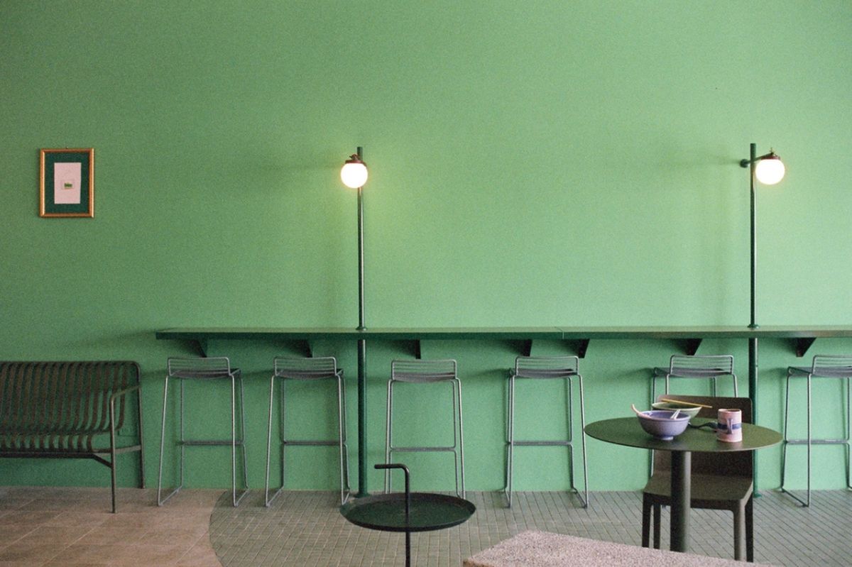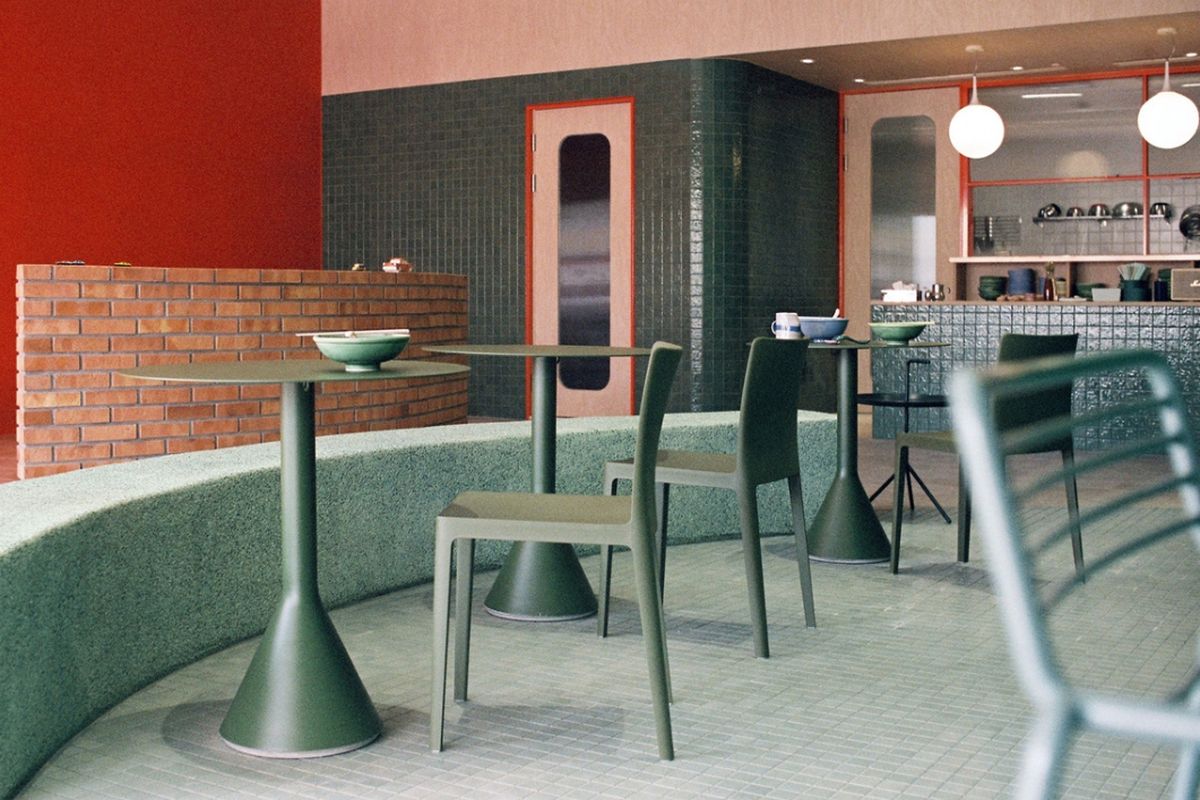 帶點復古味道的大面積色塊,於空間中自由地轉換,弧形的動線切分出各區塊不同的空間調性,OH DEAR studio把街邊傳統的紅磚、綠瓦、石墩、街燈、公園椅等元素,通過現代設計語彙加以操作,形成一幅新舊融合的美妙景象。