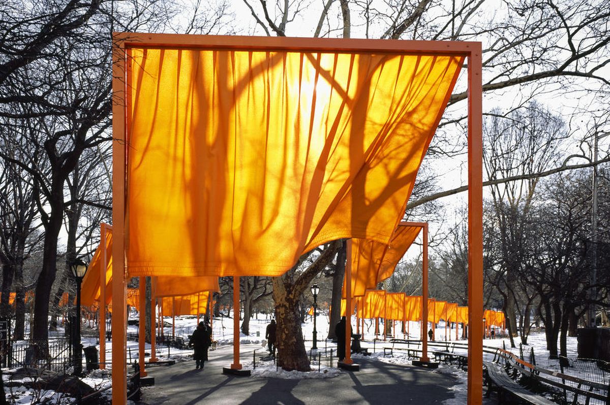 坐落在紐約中央公園這件長達37公里的裝置藝術作品,結合了7500對鋼座及橘紅門框,覆蓋上9.2萬平方公尺的橘色尼龍織品,紐約市著名觀光景點中央公園,縈繞著莊嚴又神祕的宗教氛圍。