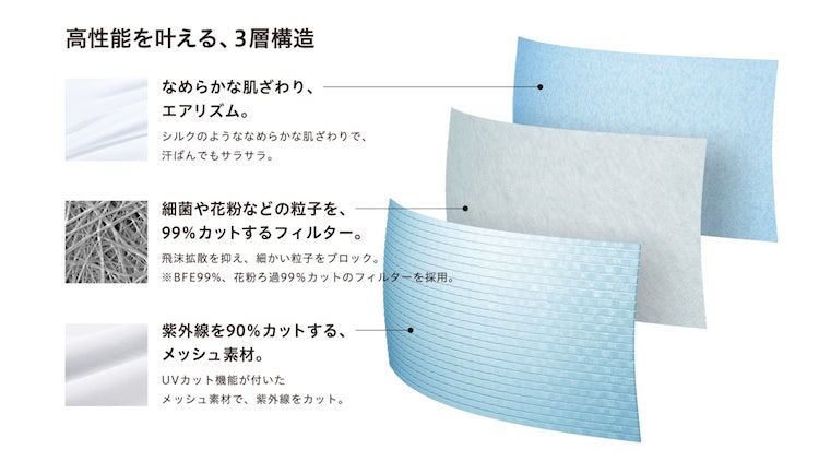 Uniqlo AIRism 系列特殊排汗清爽材質,一直以來就是許多人夏天穿的好夥伴,這次品牌運用這款特殊的布料,打造出防疫口罩,此口罩材質一共分為三層,最貼近皮膚的布料便是用品牌獨家抗汗,解熱的舒適質材,第二層則是能防止粉塵、飛沫、花粉及病毒的抗菌層,最外面則是這款口罩加分的地方,品牌運用能阻擋 90% 紫外線的布料,讓妳在夏日戴口罩的同時,也能達到良好的物理性防曬。
