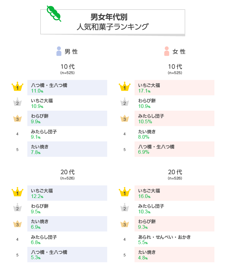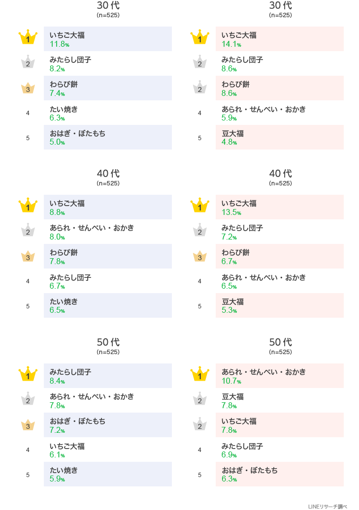 「LINE Research(リサーチ)」除了公布十大人氣和菓子,另外依照性別以及年齡分別列出不同世代的和菓子排行,可看出草莓大福可說是輾壓其他選項,在40歲以下的族群中獲得壓倒性的支持,得到多項第一名。米菓仙貝類的鹹食和菓子隨著年紀增長排名也隨之升高,在女性族群中非常受歡迎。