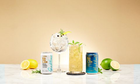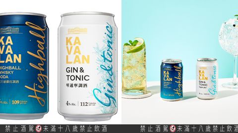 金車噶瑪蘭推出兩款調酒飲品-右為「噶瑪蘭威士忌蘇打調酒」,以噶瑪蘭經典單一麥芽威士忌融合蘇打水的清爽;左為「噶瑪蘭琴通寧調酒」採用噶瑪蘭琴酒為基底,加入苦味通寧,帶有草本與檸檬清香。