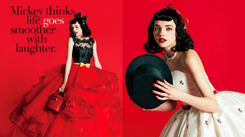 迪士尼中的經典人物米奇和米尼,也被轉化為設計元素,亮麗出現在婚紗上。滿版的米奇圖印,使得心形領澎裙禮服顯得更加俏麗動人,抑或是取材自米奇標誌性黑、黃、紅配色的紗裙禮服,都將角色的特性完美呈現於現實生活。