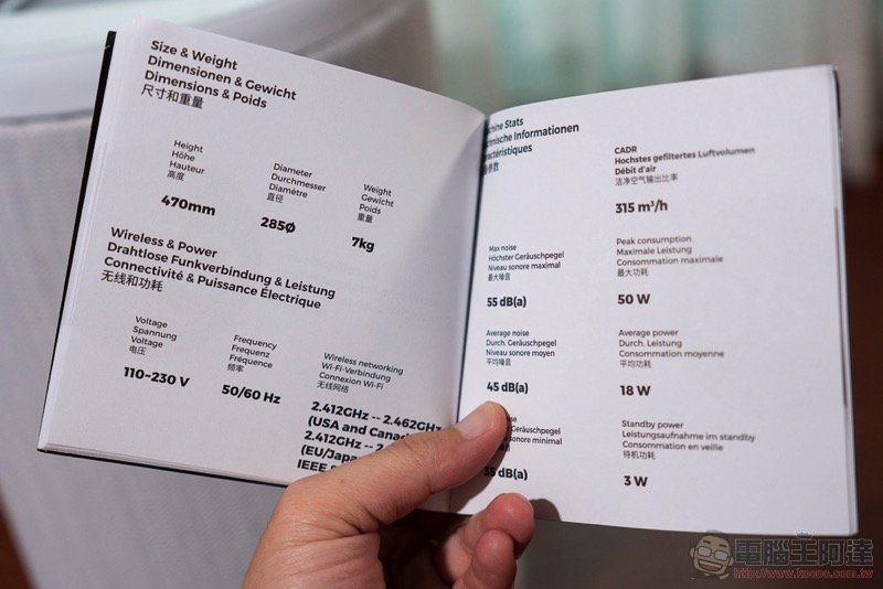 詳細的規格也有在其中列出,電源支援 110-230V、CADR 最高 315 m3 / h: