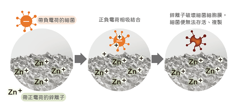 鋅離子抗菌的原理,根據原廠的敘述是由於鋅離子帶正電,而細菌的細胞壁大多帶負電,當正負離子數量不平衡就會產生拉力,最終造成細菌的細胞壁產生破洞影響細菌複製繁殖。而在鋅離子穿透細菌的細胞壁之後,也會將造成內部蛋白質變化,藉此影響代謝而導致死亡完成殺菌的機制: