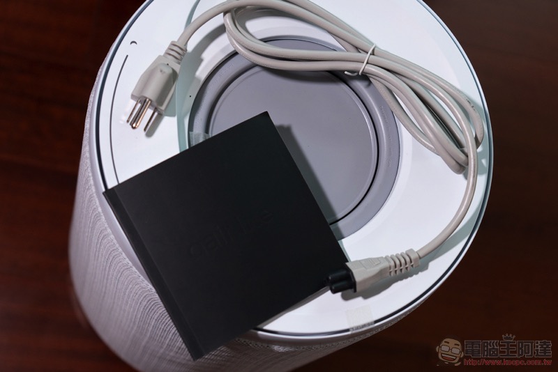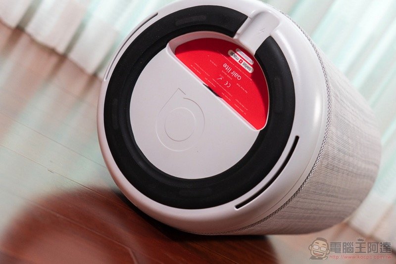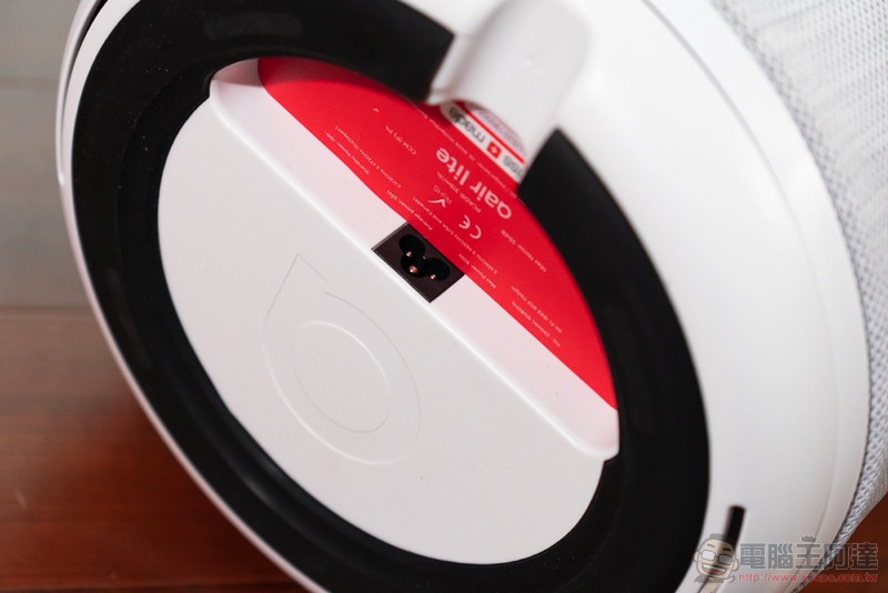 機身底部的開孔是偵測空氣品質的感測孔,上方的白色突起則是用來確認底座是否有固定確實的定位標示: