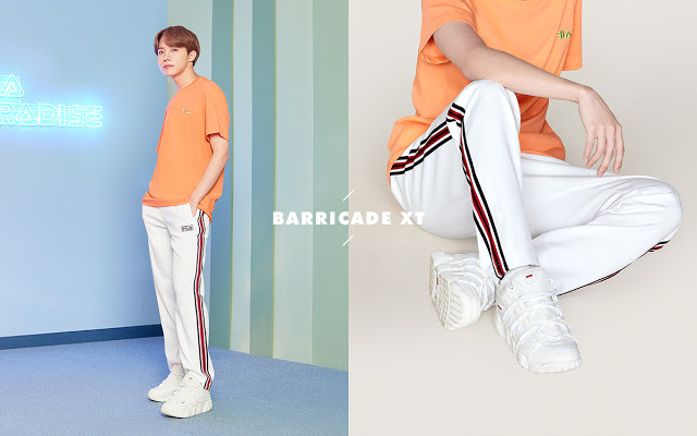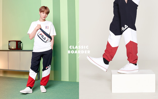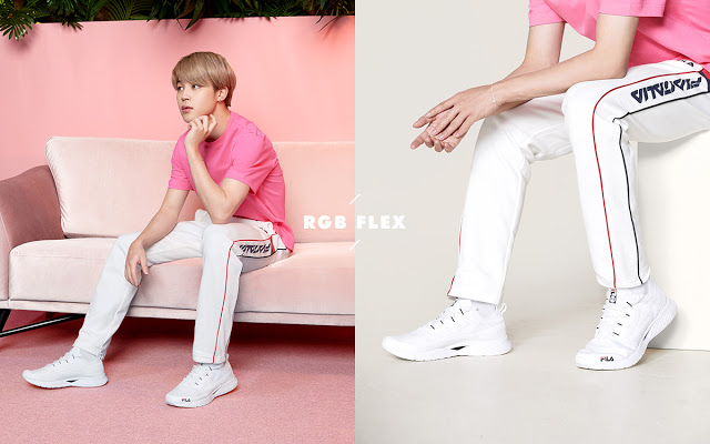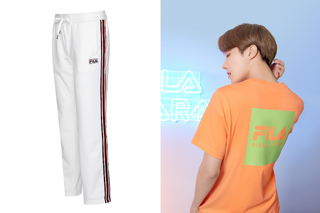 霓粉色短 T 穿起來真的很夏趴,再配上白色的 FILA 平口長褲,全場的目光焦點就是你!而且小天使 Jimin 還搭配了一雙FILA 套式慢跑鞋,展現時尚品味的同時又不失夏日休閒感~