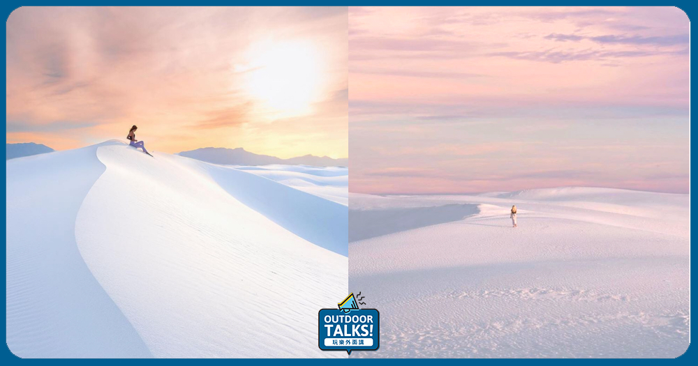 位在美國新墨西哥州南部的白沙國家公園White Sands National Park,是一個相當特別的沙漠,放眼望去看到的不是黃土,而是閃閃發光的白色細沙,有如白雪般的顏色,實際上卻是相當高溫的沙漠地區。