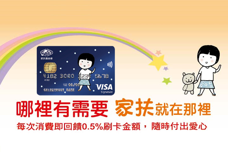 活動期間內,新戶申辦中國信託家扶公益認同卡,核卡後30天內不限通路累積刷卡消費滿888元以上,登錄享好禮二選一。