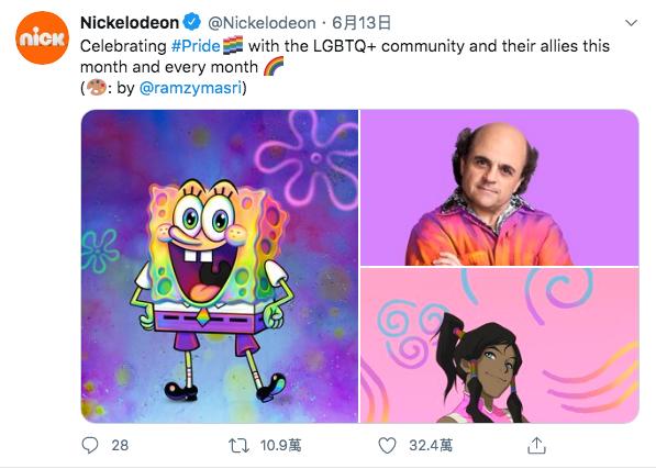 尼克兒童頻道 近日在推特上貼文慶祝「同志驕傲月(pride with the LGBTQ+)」,並附上了海綿寶寶、兒童影集《Henry Danger》中由「跨性別演員」麥可D柯恩(Michael D. Cohen)飾演的 施瓦茨(Schwoz Schwartz),以及卡通《降世神通:科拉傳奇》(Avatar:The Legend of Korra)當中「雙性戀」主角 科拉(Korra),共3張照片。