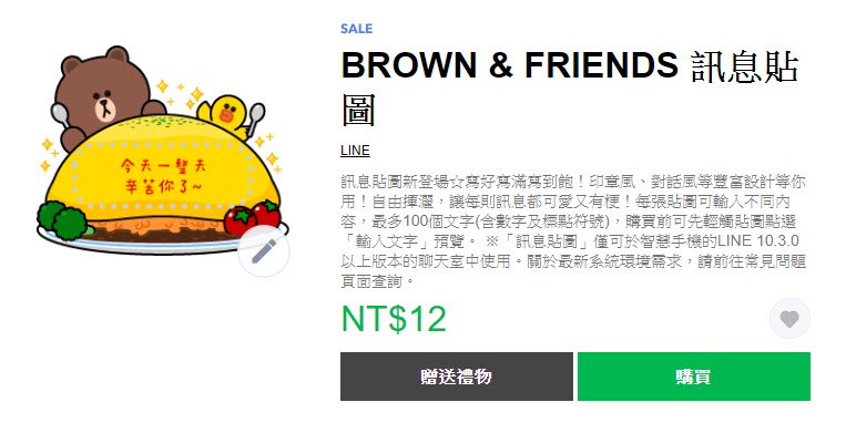 「BROWN & FRIENDS 訊息貼圖」,每張貼圖可輸入不同內容,最多100個文字(含數字及標點符號),且僅可於智慧手機的LINE 10.3.0以上版本的聊天室中使用。