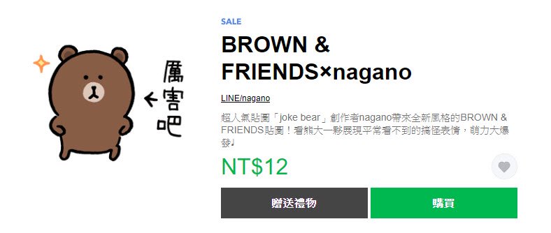 「BROWN & FRIENDS×nagano」貼圖,貼圖「joke bear」創作者nagano帶來全新風格的BROWN & FRIENDS貼圖,熊大一夥展現出平常看不到的搞怪表情。