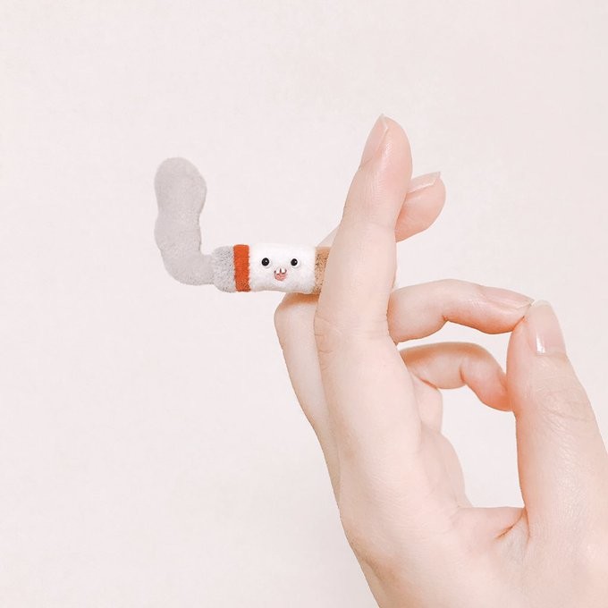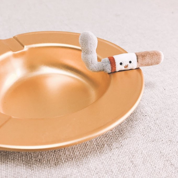 投入迷你絨毛娃娃製作的網友aska有11年的相關經驗,同樣是肚裡塞棉花、材質軟軟的絨毛娃娃和他做的就是和市場上銷售的款式不同。他擅長製作手掌大的迷你樣式,再加上擬人化的五官,即使是吸太多會家庭破碎滿口癌細胞的香煙都變得好可愛。