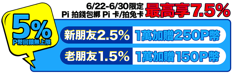 Pi 拍錢包綁定 Pi 信用卡/拍兔卡單筆滿1萬加碼回饋,Pi 新會員加碼送 250 P幣,Pi 現有會員加碼送 150 P幣(每帳號限加碼回饋1次,總限量 300,000 P幣)