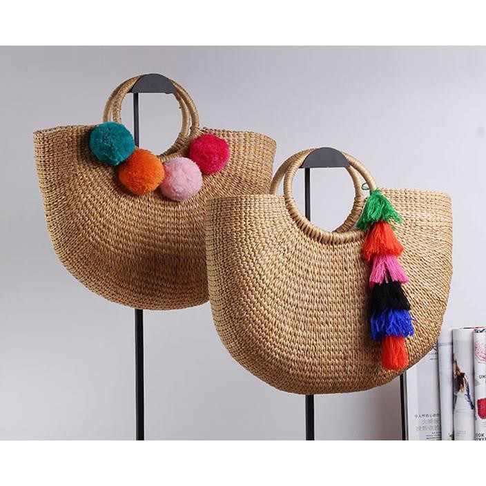 簡單俐落的手提式藤編包,通常都會在造型上增添一些俏皮可愛的裝飾,會是毛球啊、流蘇等等,讓渡假感更跳脫出來,適合想要展現優雅成熟的輕熟女呦~
