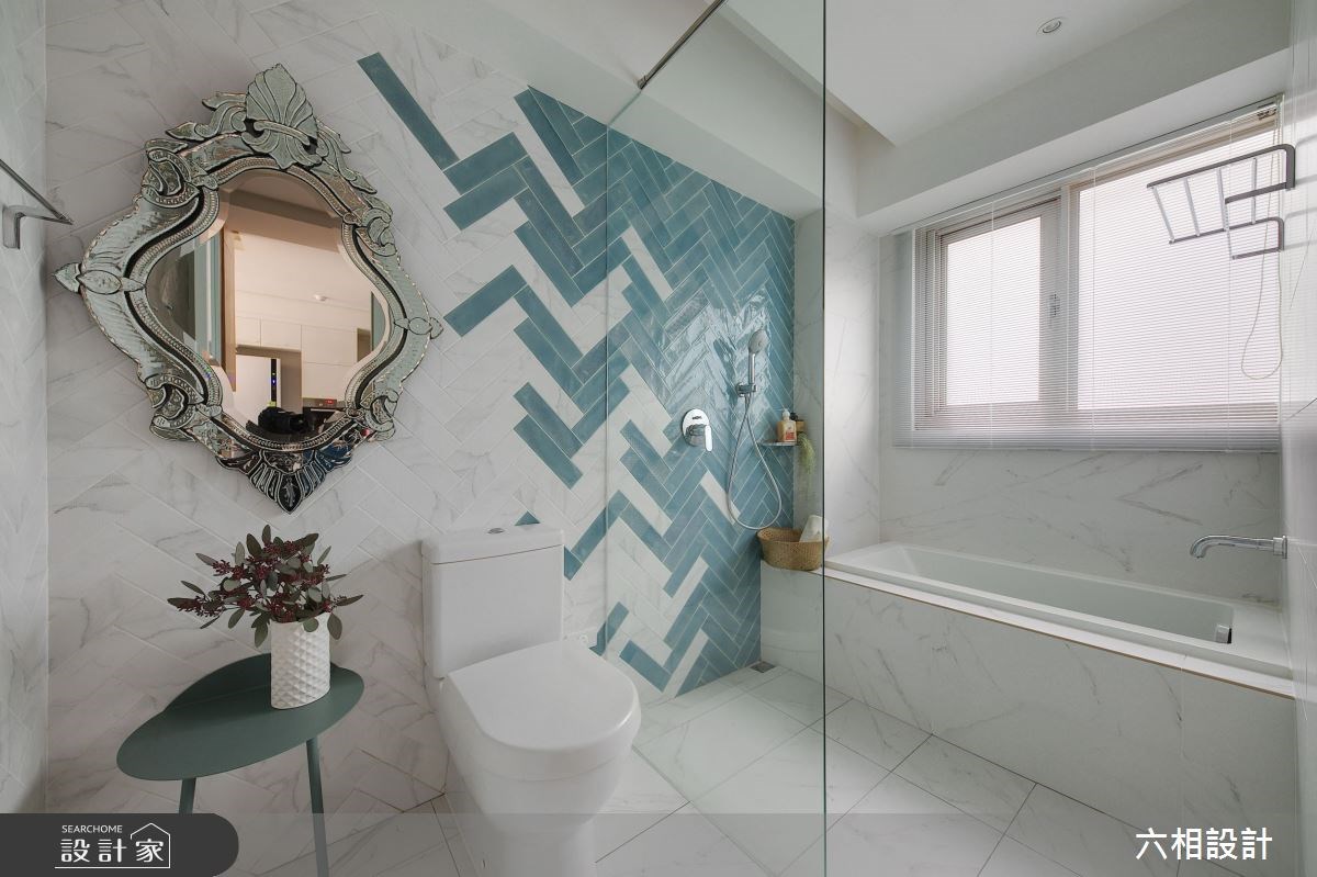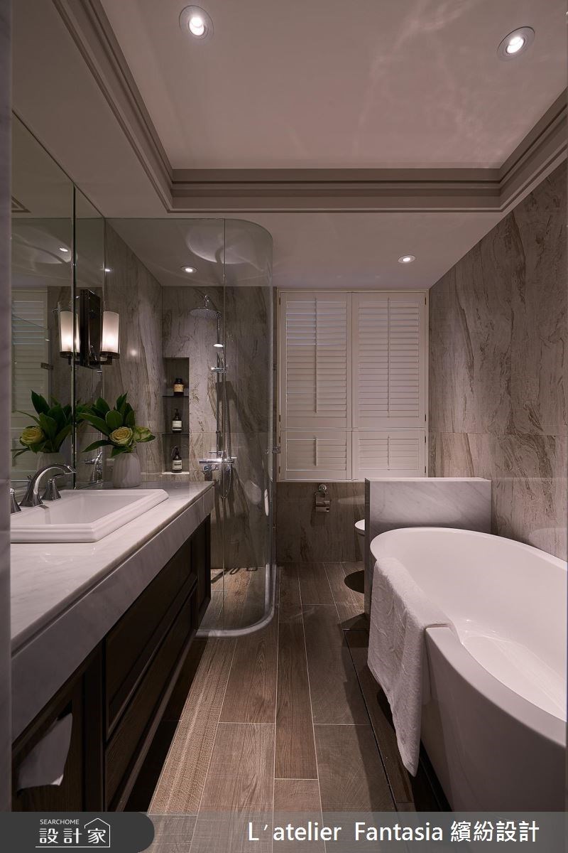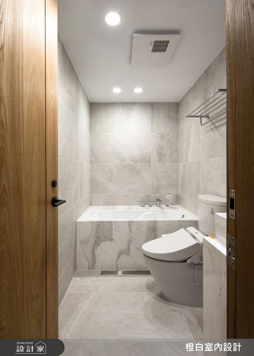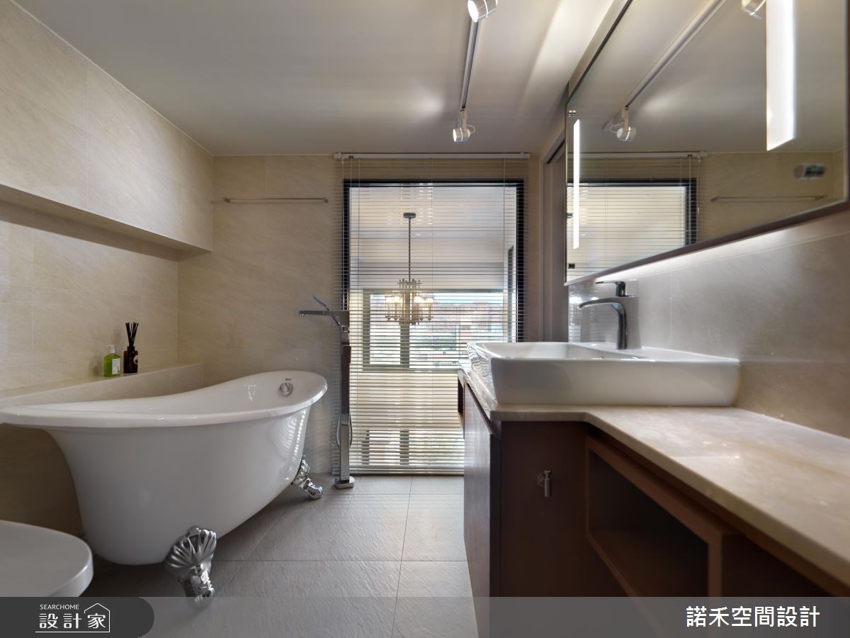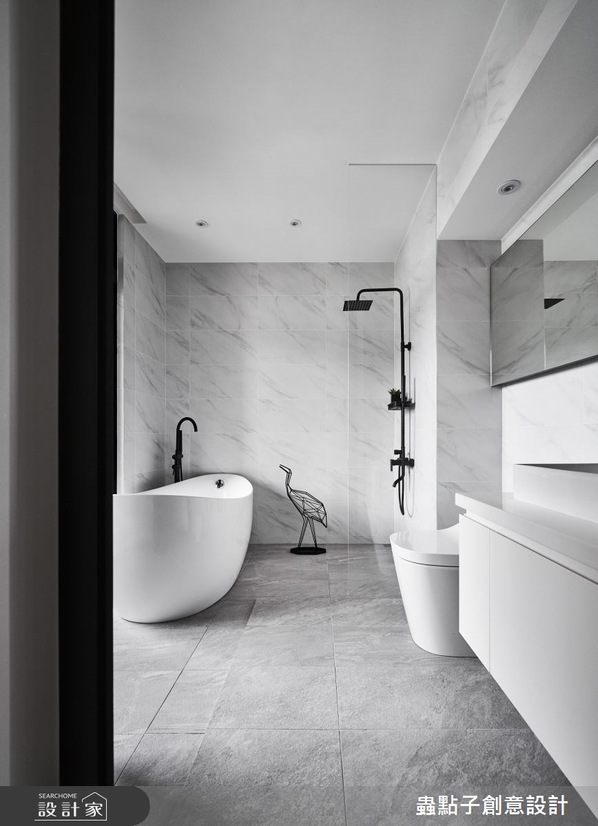 類似於小房間規劃動線的手法,將大型的家具、浴缸置放於長型格局的底端,讓洗手檯、馬桶機能靠邊安排,沐浴時動線順暢。