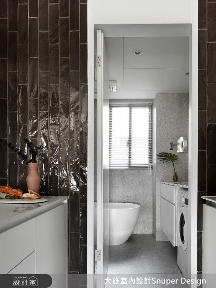 小宅內洗衣區通常伴隨著有水線的領域,例如套房常將洗衣區結合廚房領域,讓滾筒式小洗衣機內嵌整合於廚具下方,節省空間;此手法同樣也能安排於浴室領域,擺放一台小型洗衣機,讓洗滌的需求在一室解決,發揮小空間坪效。