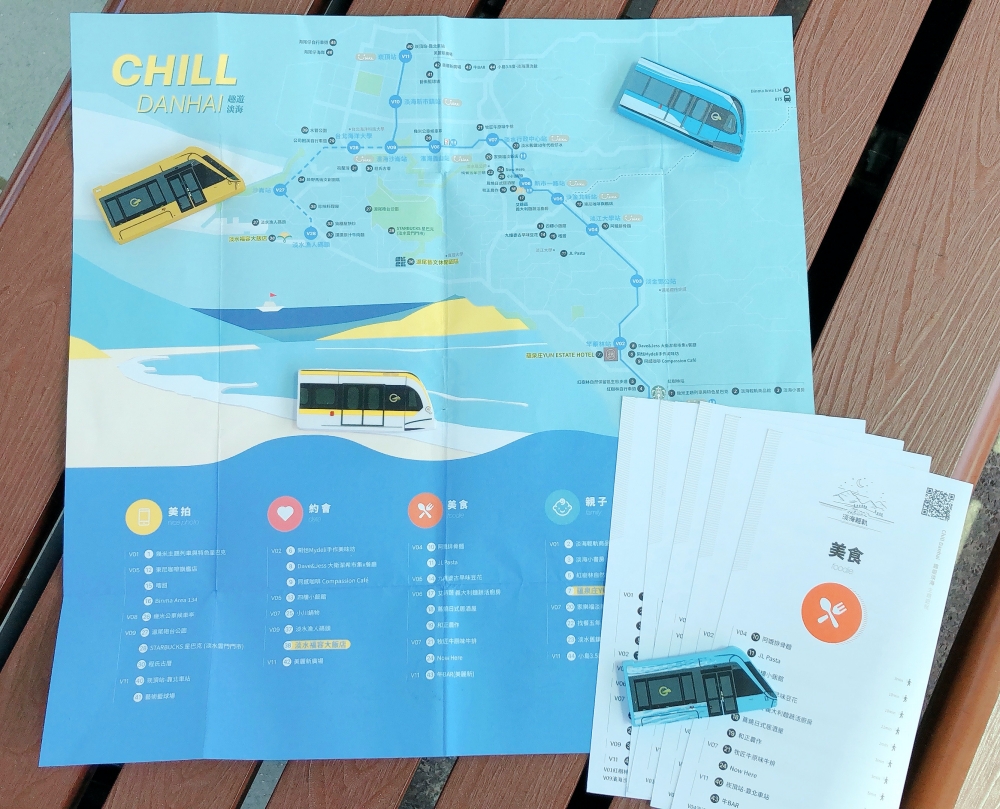之所以說是悠閒一日遊,更明確的說法是根本不需排行程、不用動腦袋,因為淡海輕軌紅樹林站的入口處就可直接索取懶人包,貼心的新北捷運公司都已經幫你把行程排好了!分為五大主題式玩法:美拍、約會、美食、親子、自行車,都有專屬的小卡,質感超級符合年輕族群,每張小卡的右上角都有附QR CODE,背面都已經註記好店家地址、營業時間特色、電話,裡面介紹的店家及景點都擁有超人氣,有好幾間都是我收藏在Google Map必去的景點啊!