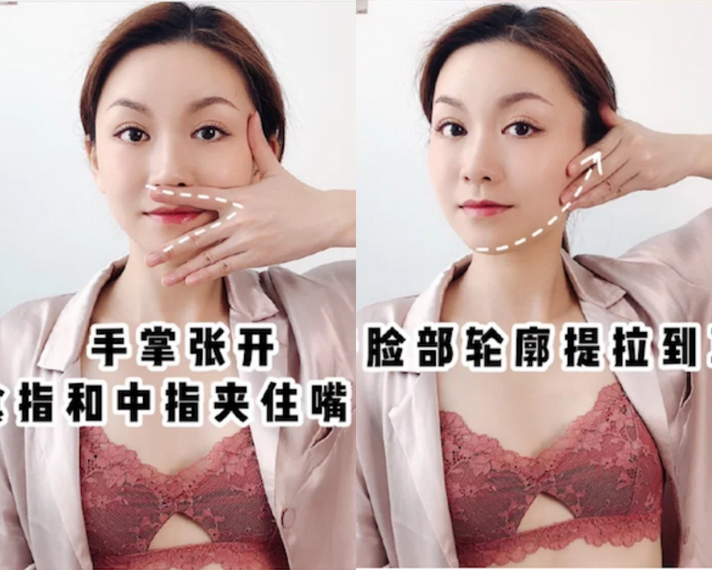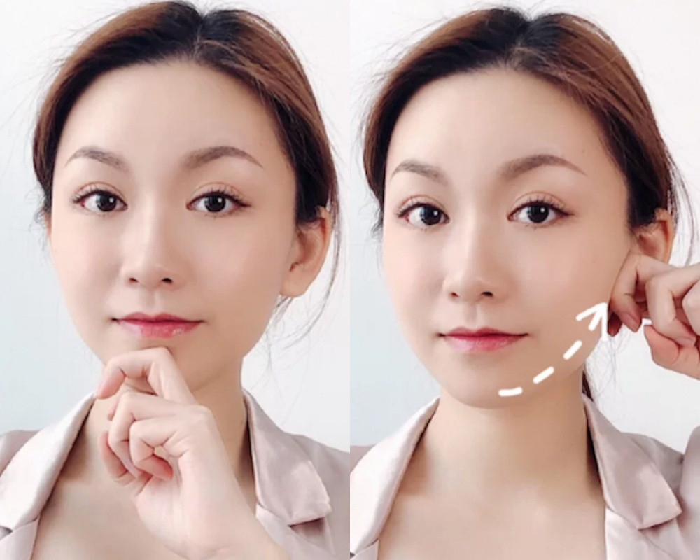 第一步就是先塑造下頷線條~首先將食指和中指彎曲,並用兩只關節夾住下巴,慢慢提拉到耳朵下,並在咬肌處稍稍用力按壓,左右臉各做20次!這一步能夠讓下頷線條變得更明顯,也讓視覺上臉部提拉效果更明顯!