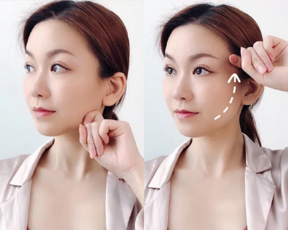 接著手指頭一樣呈現勾狀,並從咬肌處開始,慢慢提拉到太陽穴~這步每一側做10次。這組動作可以幫助方臉、咬肌突出的女孩塑形,讓正面臉型更好看!